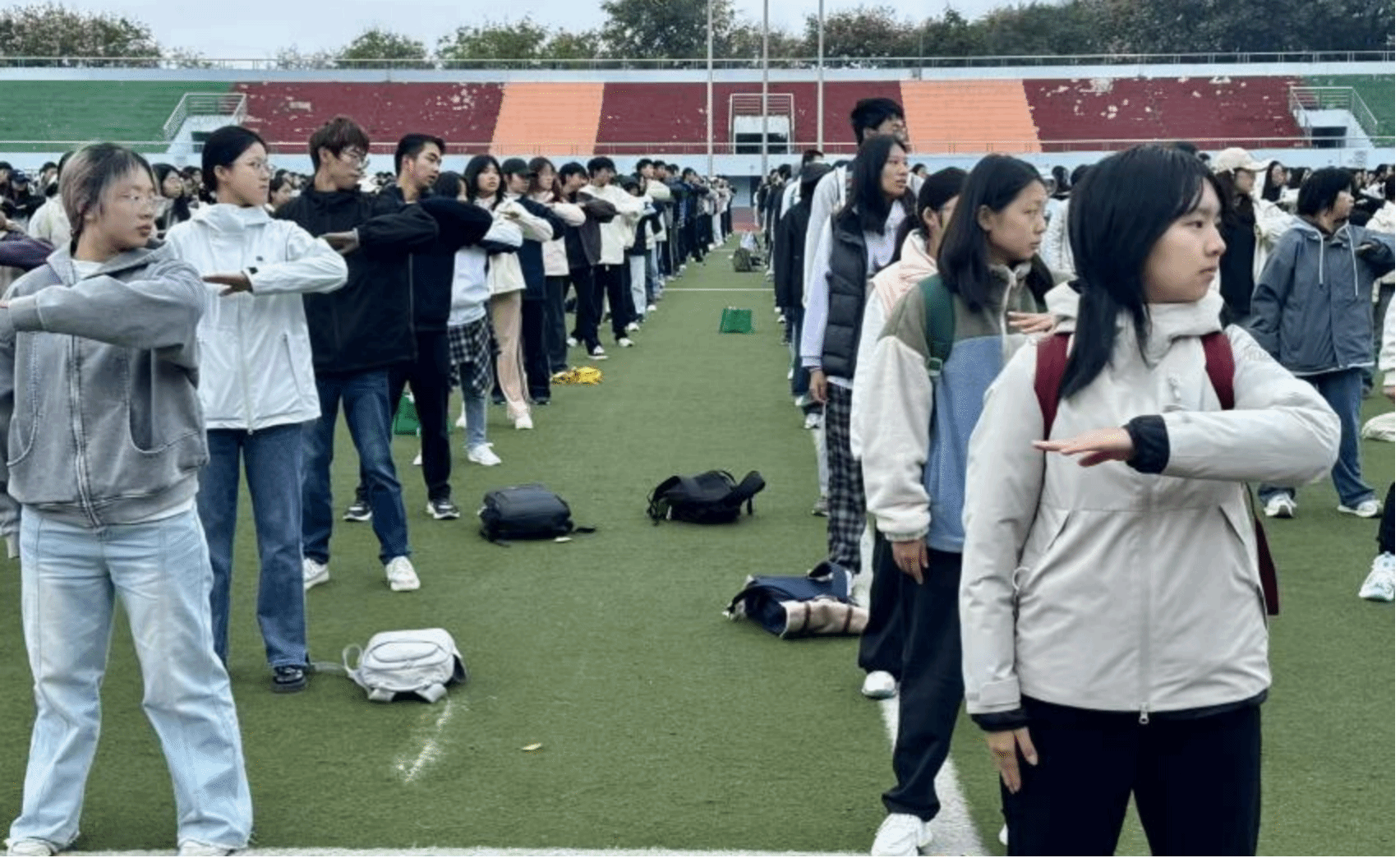 傍晚时分,第二运动场上,华农林肯学院2025级本科生7个班级的同学们在学院广播体操总教练、主教练的带领下整齐列队,开始了日常的训练,为运动会开幕式做准备。