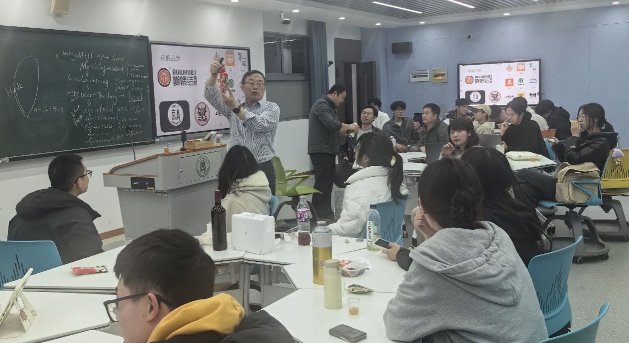 聂聪教授从啤酒的起源与定义切入,系统讲解了啤酒分类体系、酿造原料及工艺流程。他围绕感官评价体系、苦味值测定原理等技术要点展开分析,并结合当前产业现状,深入解读中国精酿啤酒的消费趋势。从消费动机到品类选择,聂聪教授多维度分析了精酿消费人群的特征与偏好,呈现了消费升级背景下精酿啤酒市场的发展动向。他还带领学生现场闻酒花、品鉴不同风味的啤酒,通过感官体验加深对啤酒品质特征的理解。